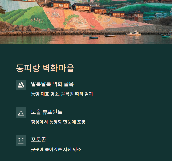 | 동피랑 벽화마을 | 벽화+전망 | 산책, 사진 명소 |