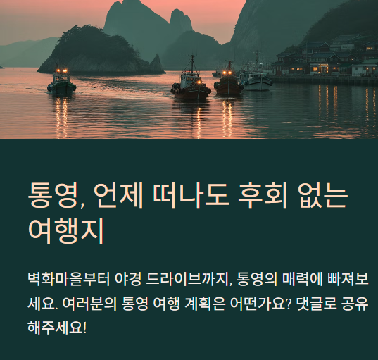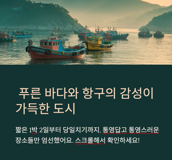 짧은 1박 2일 여행부터 당일치기 힐링 코스까지, 통영은 언제 떠나도 후회 없는 여행지입니다.