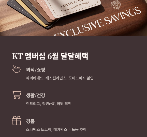 KT 멤버십 6월 ‘달달혜택’은 티빙 외에도 풍성한 구성으로 되어 있어요.