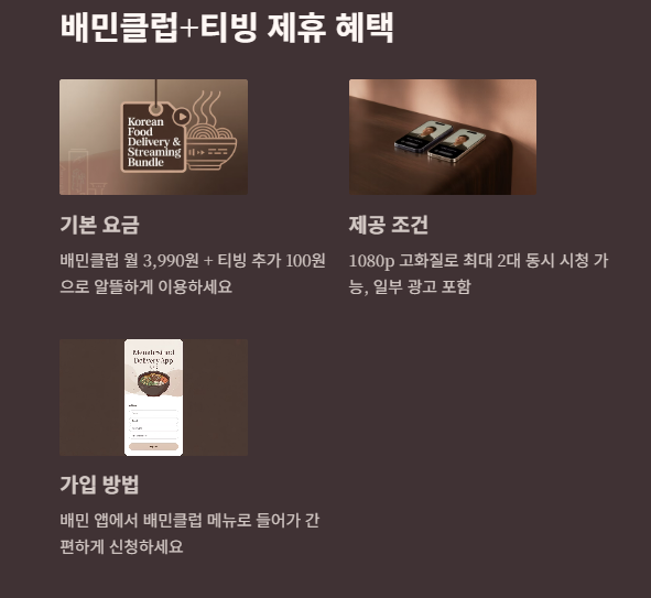 - 기본요금: 배민클럽 월 3,990원 + 티빙 광고형 요금제 100원 추가