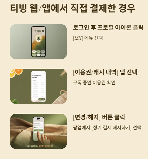 | 직접 결제 | 티빙 앱/웹 → MY → 이용권 해지 |