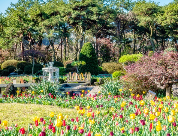 입구에 들어서자마자 만난 시원한 분수와 봄꽃들의 향연은 첫인상부터 매우 인상적이었어요.