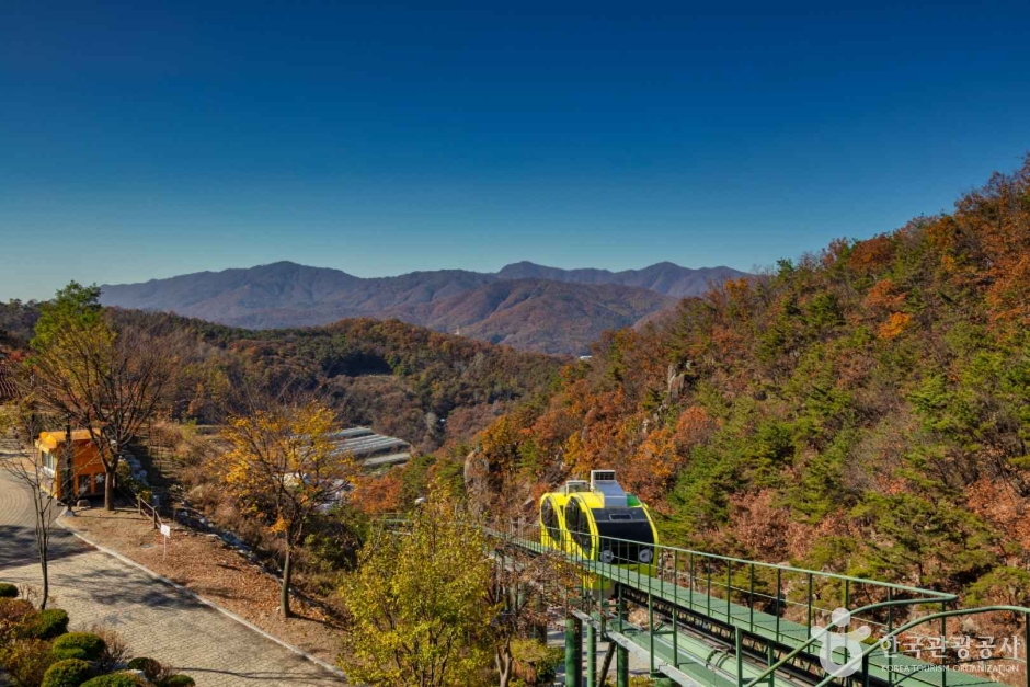 채석장이었던 만큼 경사가 있는 포천 아트밸리는 정상까지 도보로 이동 시 약 15~20분 정도 소요됩니다. 하지만 모노레일을 이용하면 약 5분 만에 편하게 올라갈 수 있어요.