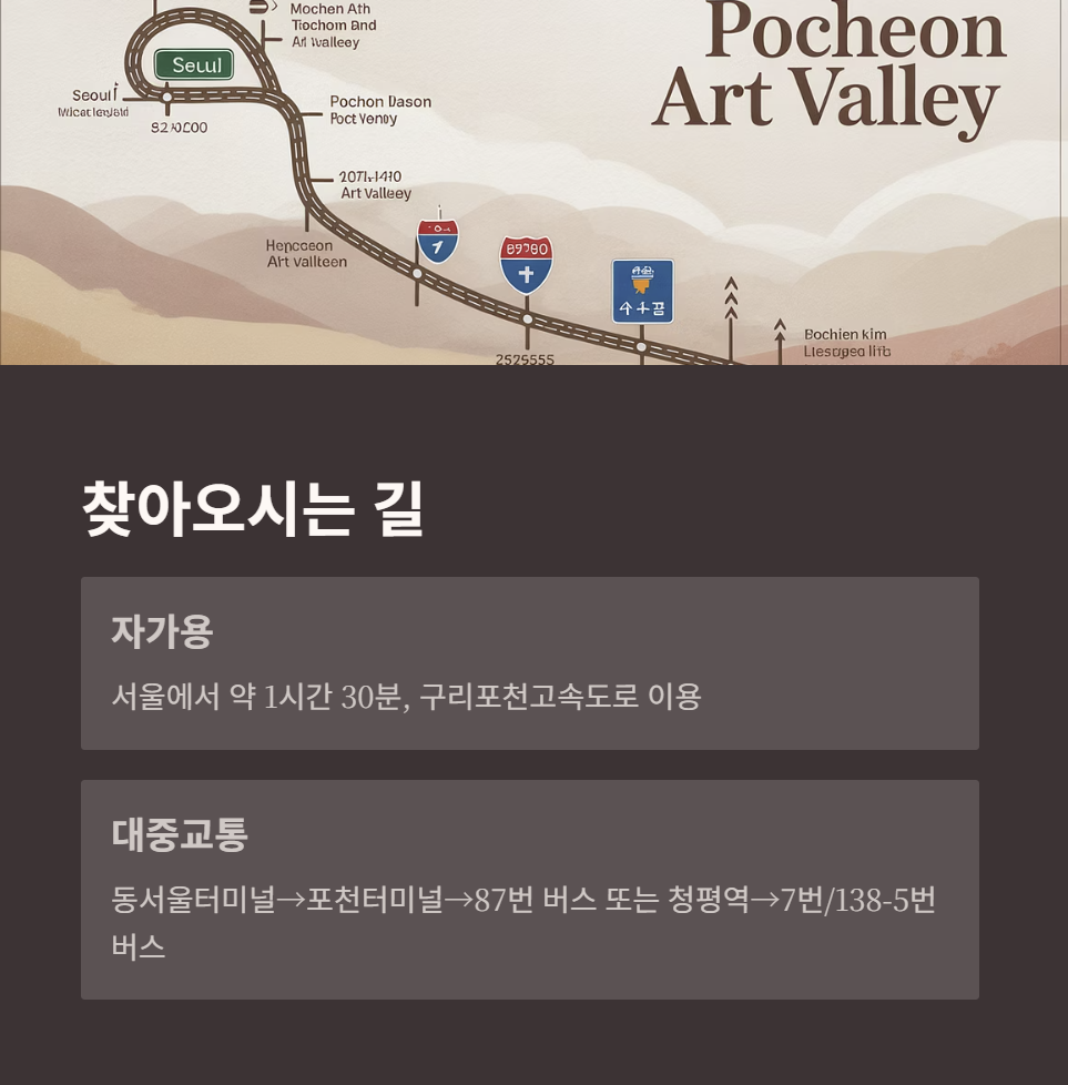 서울에서 포천 아트밸리까지는 약 1시간 30분 소요됩니다.