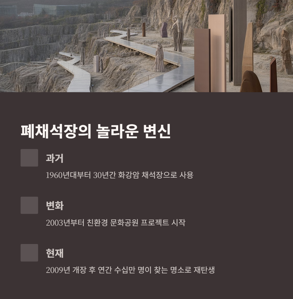 건축용 석재로 쓰이던 돌을 캐내며 주변 경관이 파괴됐고, 이후 채석장이 폐쇄된 뒤엔 흉물스럽게 방치되기도 했습니다. 하지만 2003년부터 포천시에서 이 지역을 친환경 문화공원으로 조성하는 프로젝트를 시작하면서 지금의 아름다운 공간으로 재탄생했습니다. 2009년 정식 개장한 이후, 다양한 문화예술 프로그램과 자연을 동시에 즐길 수 있는 복합 문화공간으로 자리 잡게 되었죠.