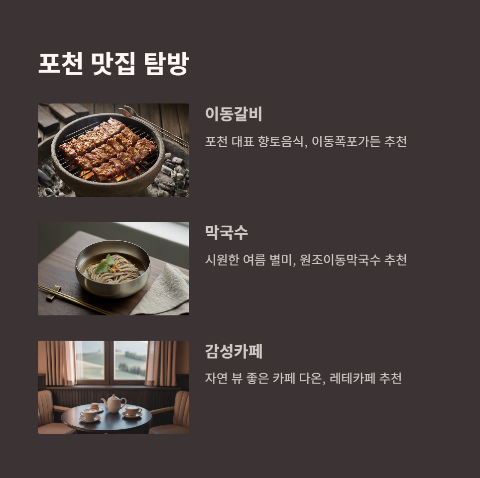 먼저 이동갈비는 포천을 대표하는 향토음식입니다. 양념된 갈비를 숯불에 구워 먹는 방식으로, 고기 본연의 맛과 양념이 어우러져 진한 풍미를 느낄 수 있어요.