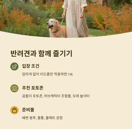 - 반려견을 위한 쉼터나 그늘 구간은 다소 적은 편이니 쿨매트나 휴식용 캐리어가 유용해요
