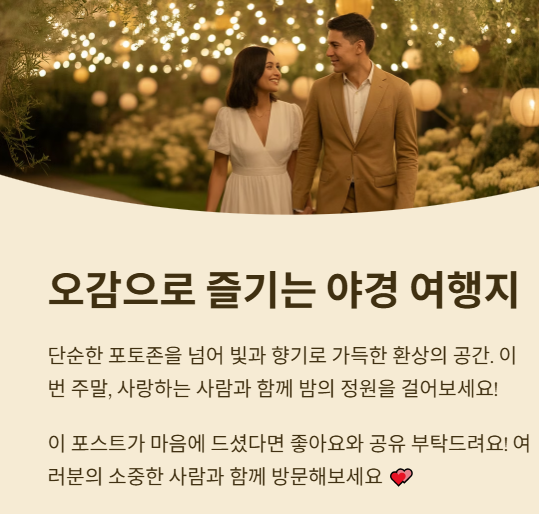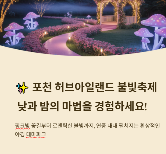 포천 허브아일랜드 불빛축제는 단순한 포토존을 넘어 오감으로 즐기는 야경 여행지로, 누구와 함께여도 만족할 수 있는 장소입니다.