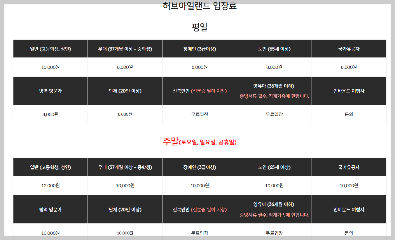 - 주말 및 공휴일: 성인 10,000원 / 청소년 8,000원