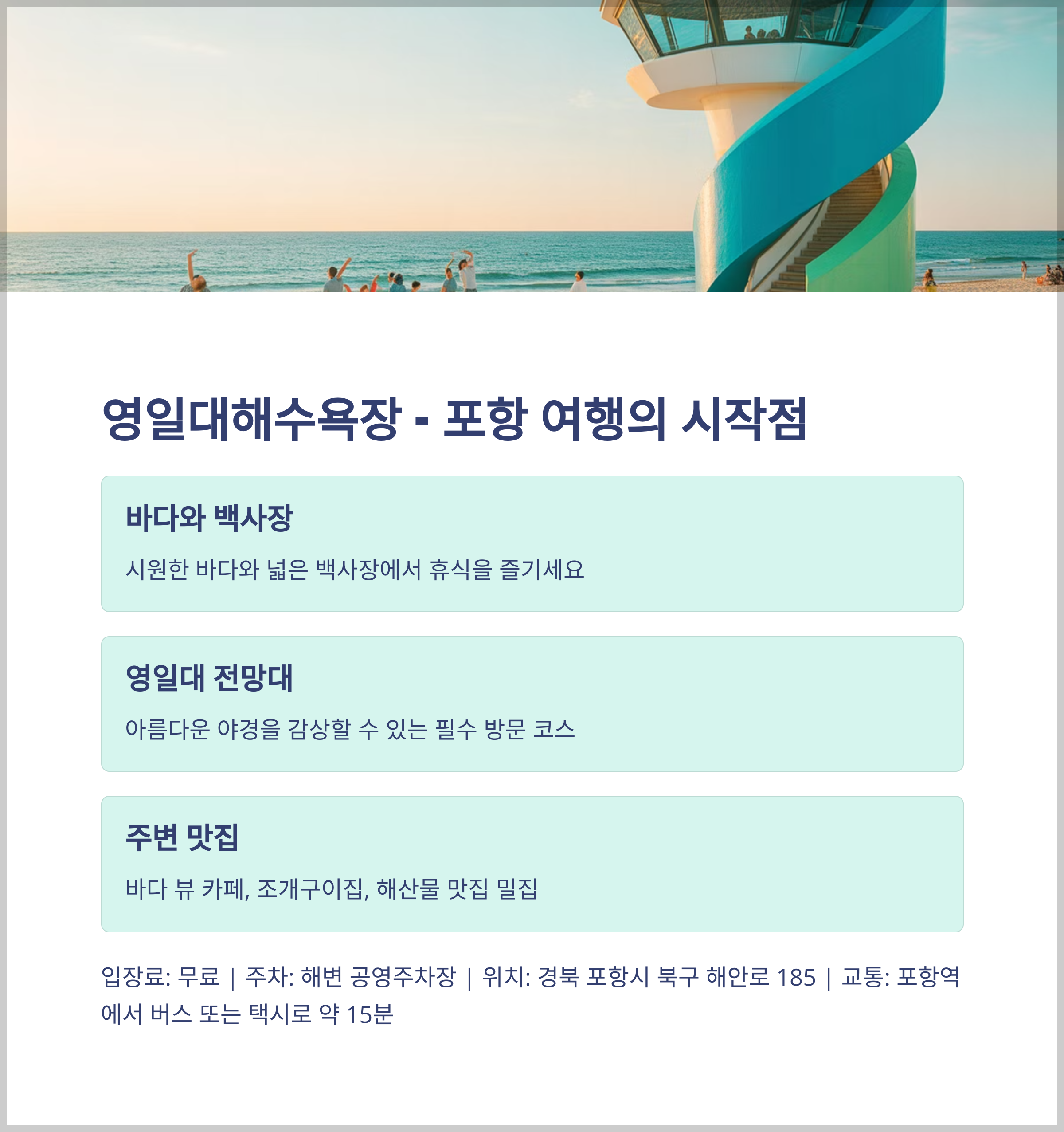 경북 포항은 바다, 역사, 트렌디한 스폿까지 모두 갖춘 여행지입니다. 이번 글에서는 포항 가볼 만한 곳 베스트 10을 소개하면서 입장료, 주차 정보, 교통편, 주변 맛집까지 알차게 정리해 드릴게요.