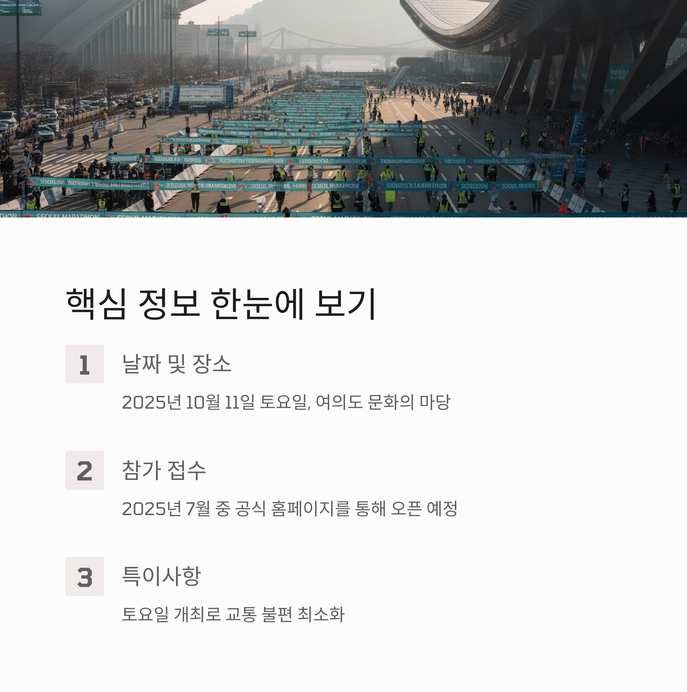 다른 마라톤 대회와 달리 토요일에 개최되는 점이 특징인데요. 교통 불편을 최소화하기 위해 여의도 문화의 마당을 집결지로 잡은 것으로 보입니다. 많은 러너들이 벌써부터 행사 소식에 흥분을 감추지 못하고 있으며, 과연 코스와 인원 규모는 어떤 식으로 구성될지, 가족 단위 참가자들도 함께할 수 있는 행사일지에 대한 궁금증이 커지고 있습니다.