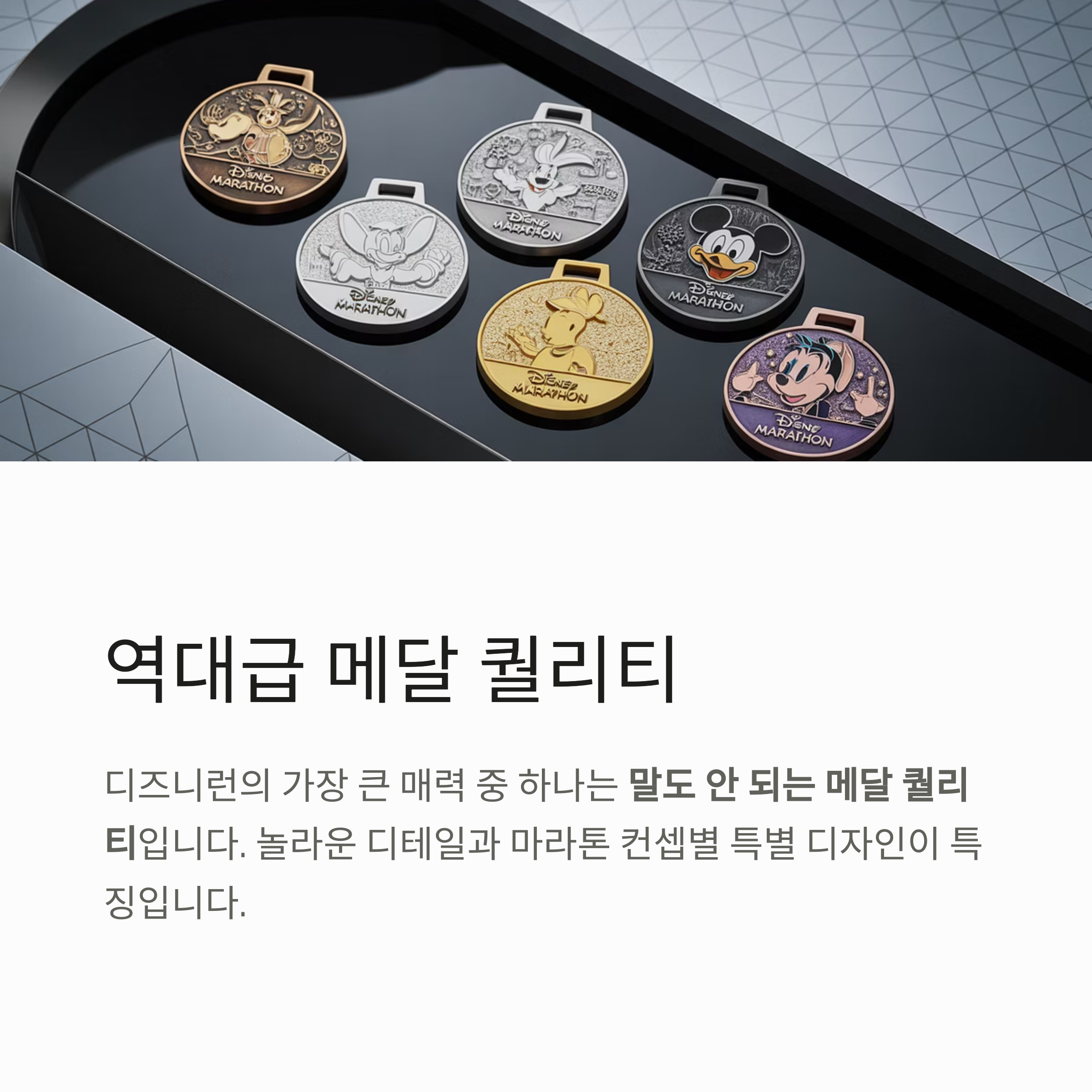 2025 디즈니런을 기대해야 하는 가장 큰 이유 중 하나는 바로 '말도 안 되는 메달 퀄리티'입니다. '조잡함'이라고는 찾아볼 수 없는 놀라운 디테일을 보여주는 디즈니런 메달은 마라톤 콘셉트별로 매번 다르게 제작됩니다.