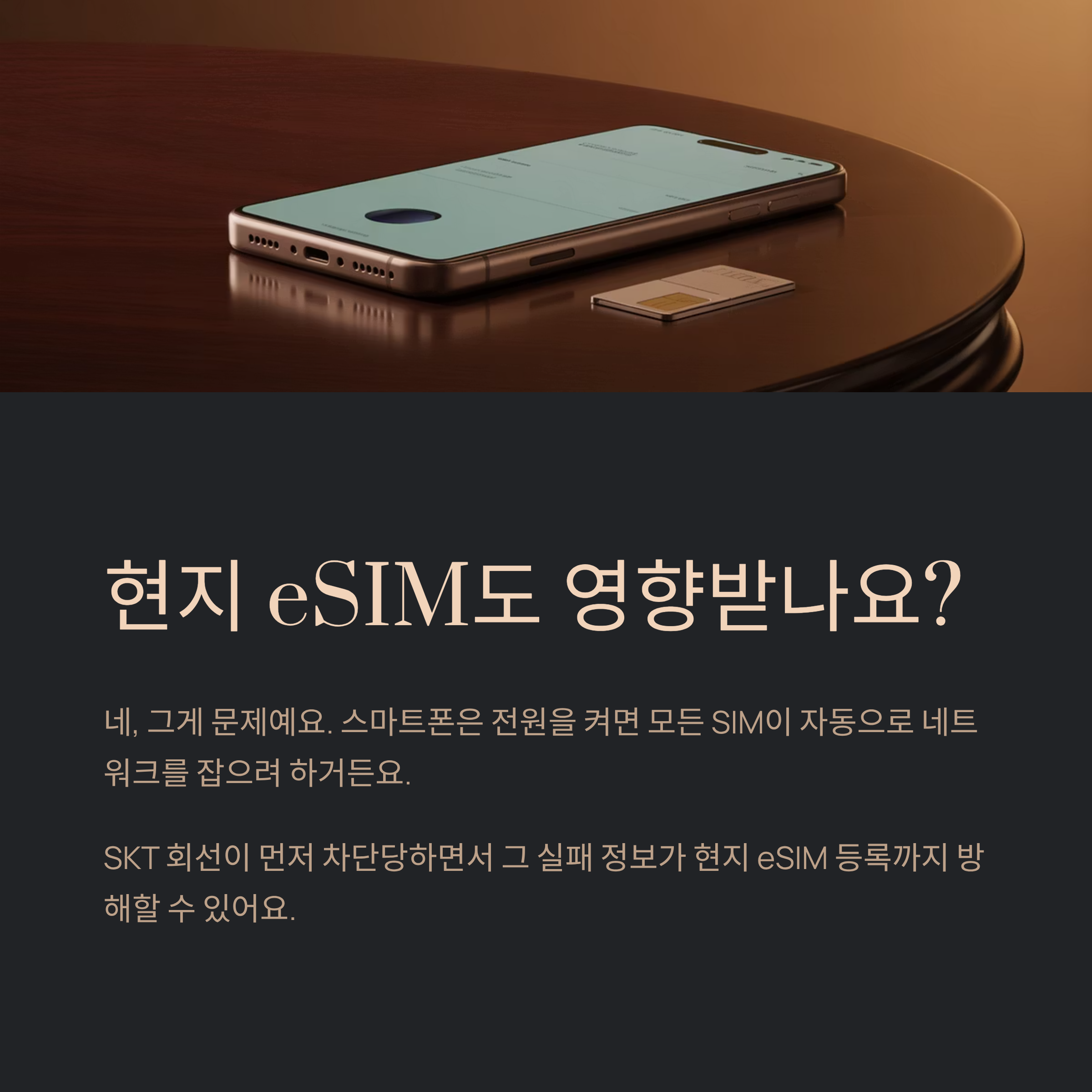 문제는 여기서 시작돼요. 저도 그랬어요. “나는 현지 eSIM만 쓸 건데?”라고 생각했거든요. 근데 스마트폰이라는 게요, 전원을 켜자마자 모든 SIM 회선이 자동으로 네트워크를 잡으려고 움직이거든요. SKT 회선이 먼저 신호를 뿌리다가 차단당하면서, 그 실패 정보가 기기 전체에 영향을 주는 경우가 있다는 거죠.