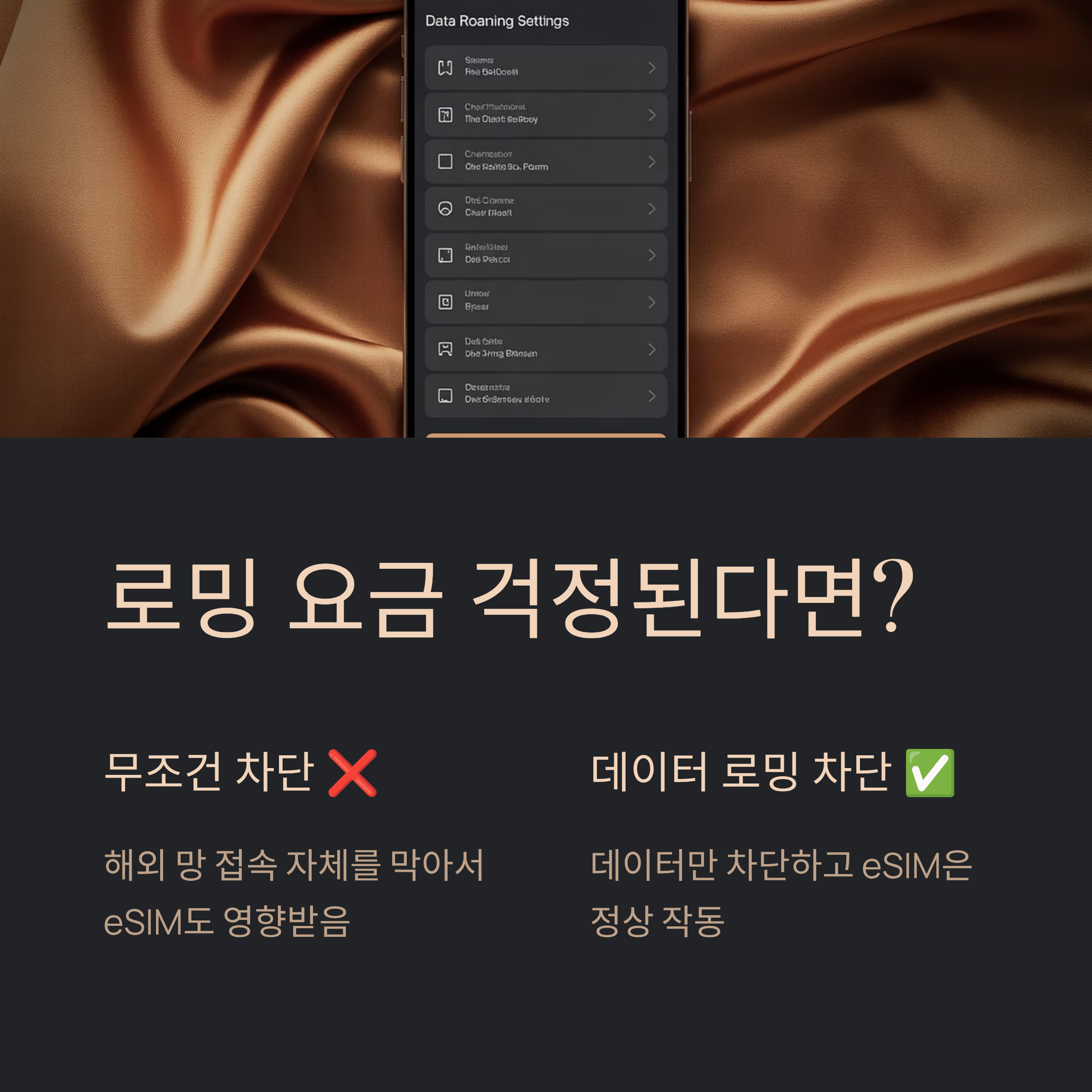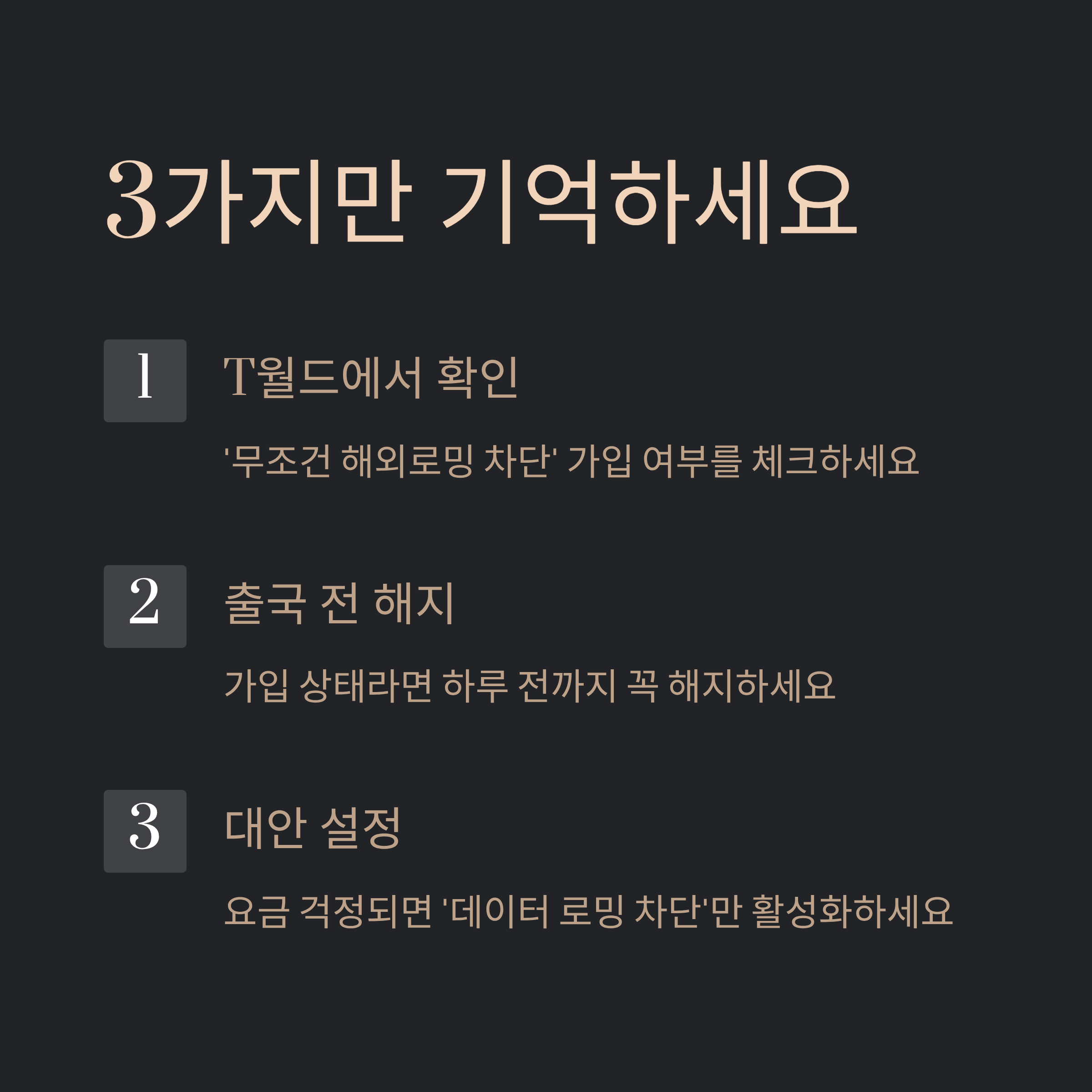“그래도 로밍 요금 폭탄이 걱정된다”고 생각되신다면, ‘데이터 로밍 차단’ 서비스만 활성화해두는 것도 방법이에요. 이건 해외 망에 접속은 되지만, 데이터 사용만 막아주는 거라서, eSIM에는 전혀 영향을 주지 않아요. SKT 회선은 차단돼도, 현지 eSIM은 그대로 잘 작동하니까요.