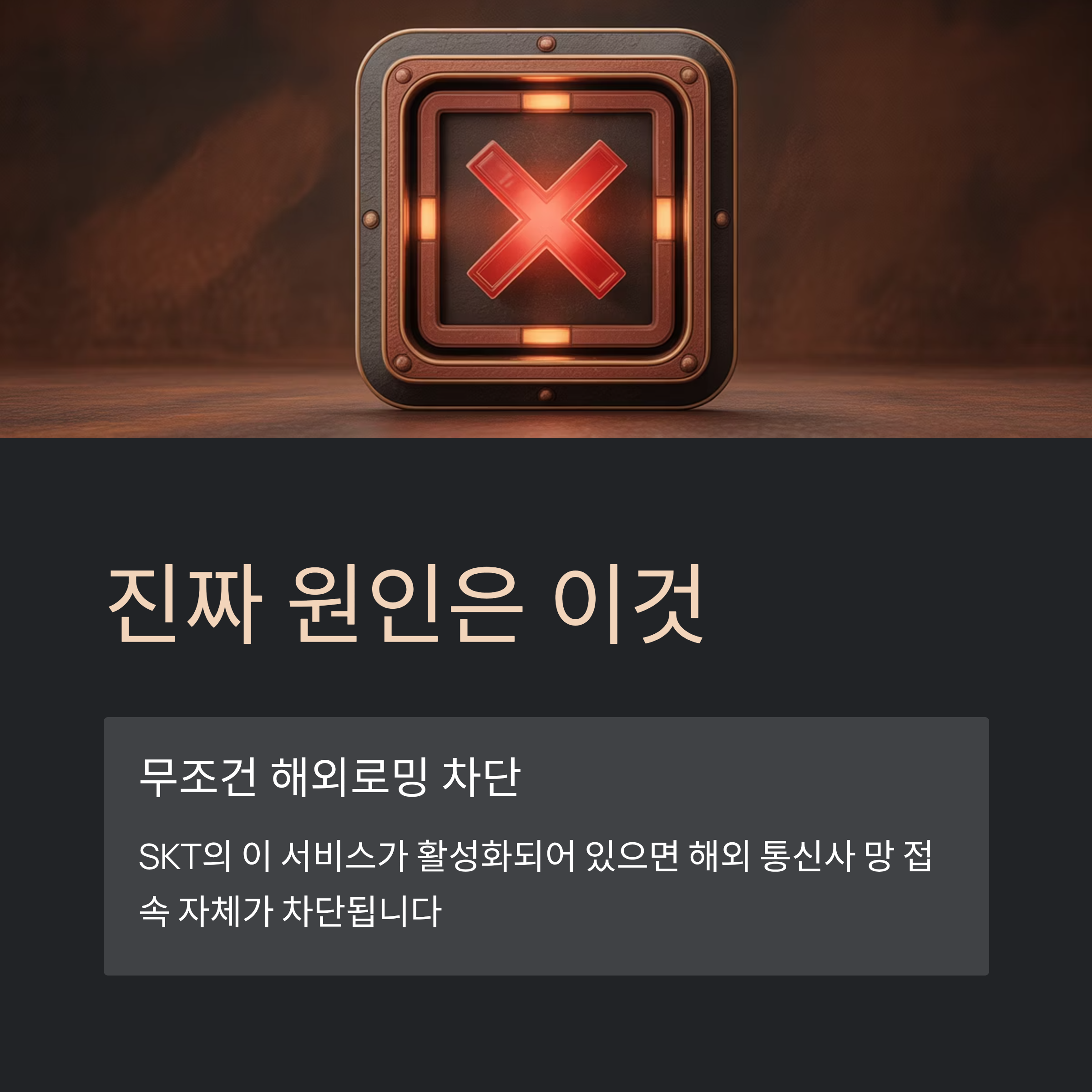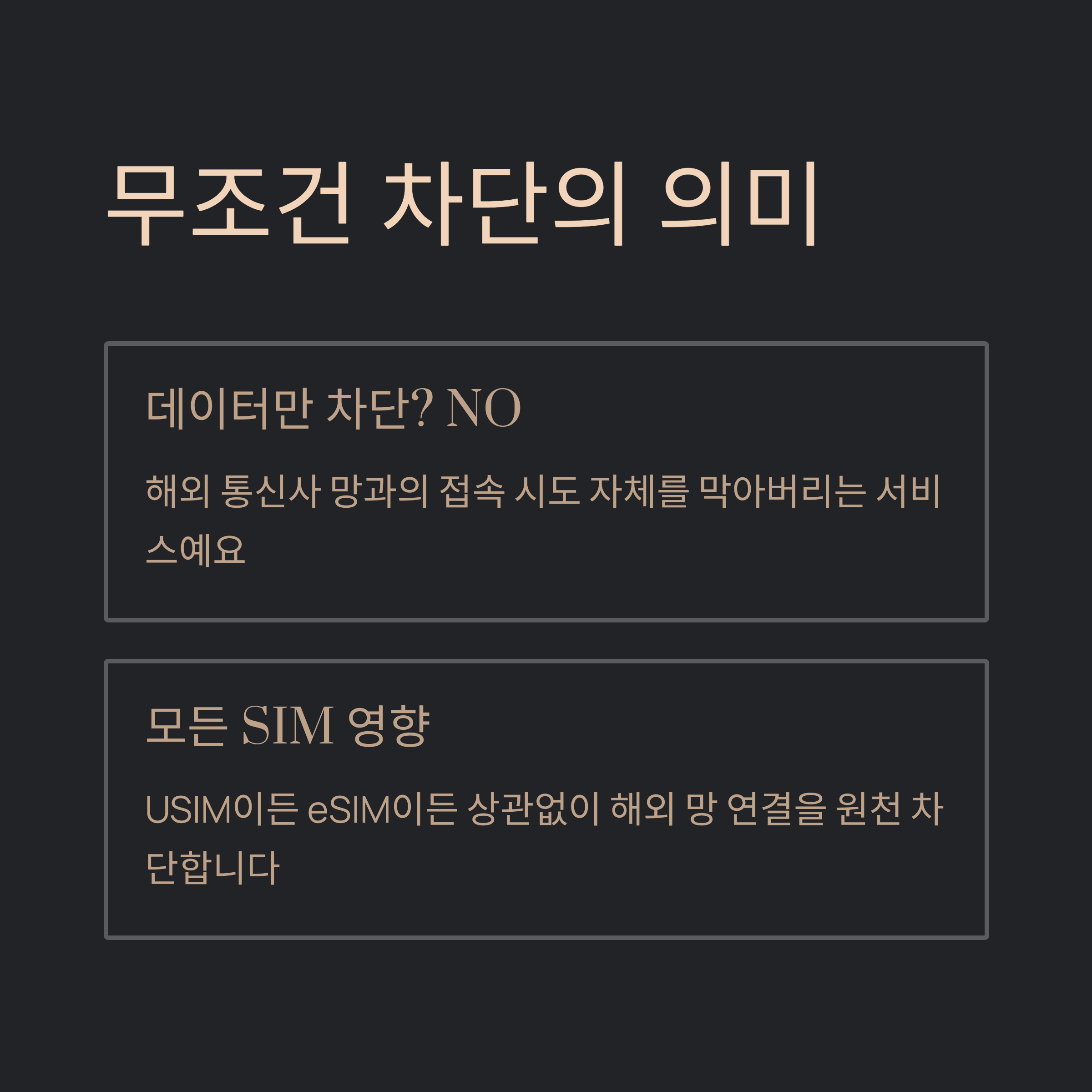 처음엔 그냥 데이터만 안 되게 막아주는 거라고 생각했어요. 그런데 ‘무조건’이라는 단어가 괜히 붙은 게 아니더라고요. 이건 데이터만이 아니라, 아예 해외 통신사 망과 접속 자체를 막아버리는 서비스더라고요. SKT 가입자의 SIM(USIM이든 eSIM이든) 자체가 해외 망과 연결되려는 시도조차 하지 못하게 만드는 거예요.