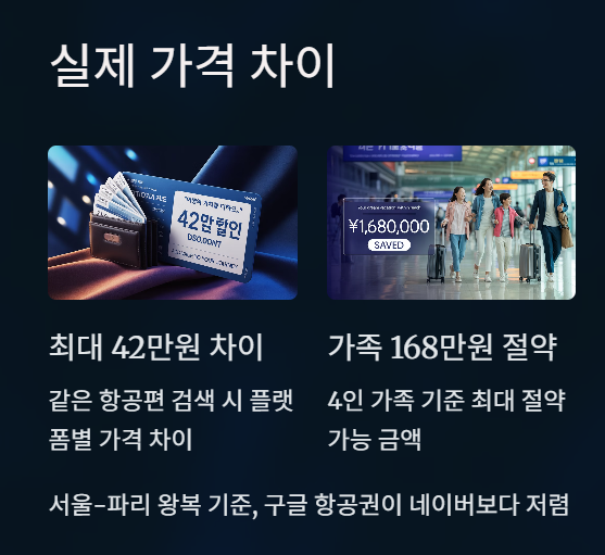 같은 항공편인데도 최대 42만 원 차이. 가족 4인 기준 168만 원 절약 가능합니다. 항공권 검색 플랫폼의 선택만으로 여행 경비가 확연히 달라질 수 있다는 증거입니다.