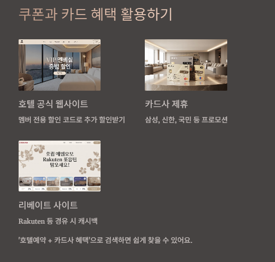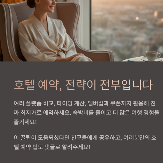 이런 할인 정보는 ‘호텔예약 + 카드사 혜택’으로 검색하면 쉽게 찾을 수 있어요. 호텔예약싸게하는법의 핵심 도구로 적극 활용해 보세요.