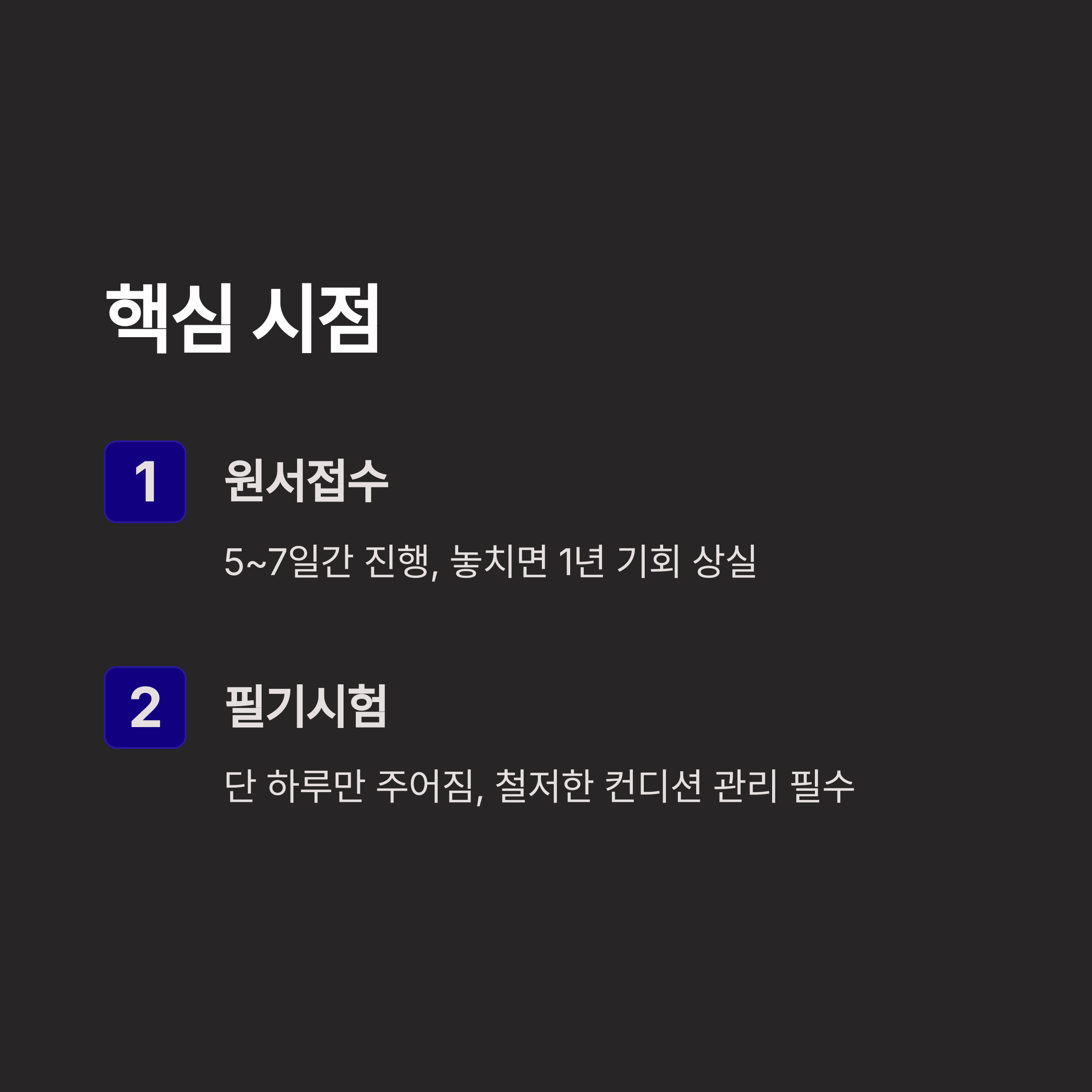 가장 중요한 일정은 원서접수 시작일과 필기시험 일자입니다. 원서접수는 대체로 5~7일간 진행되며, 이를 놓치면 1년의 노력이 수포로 돌아갈 수 있어요. 필기시험 역시 단 하루만 주어지므로 철저한 컨디션 관리가 필요합니다.