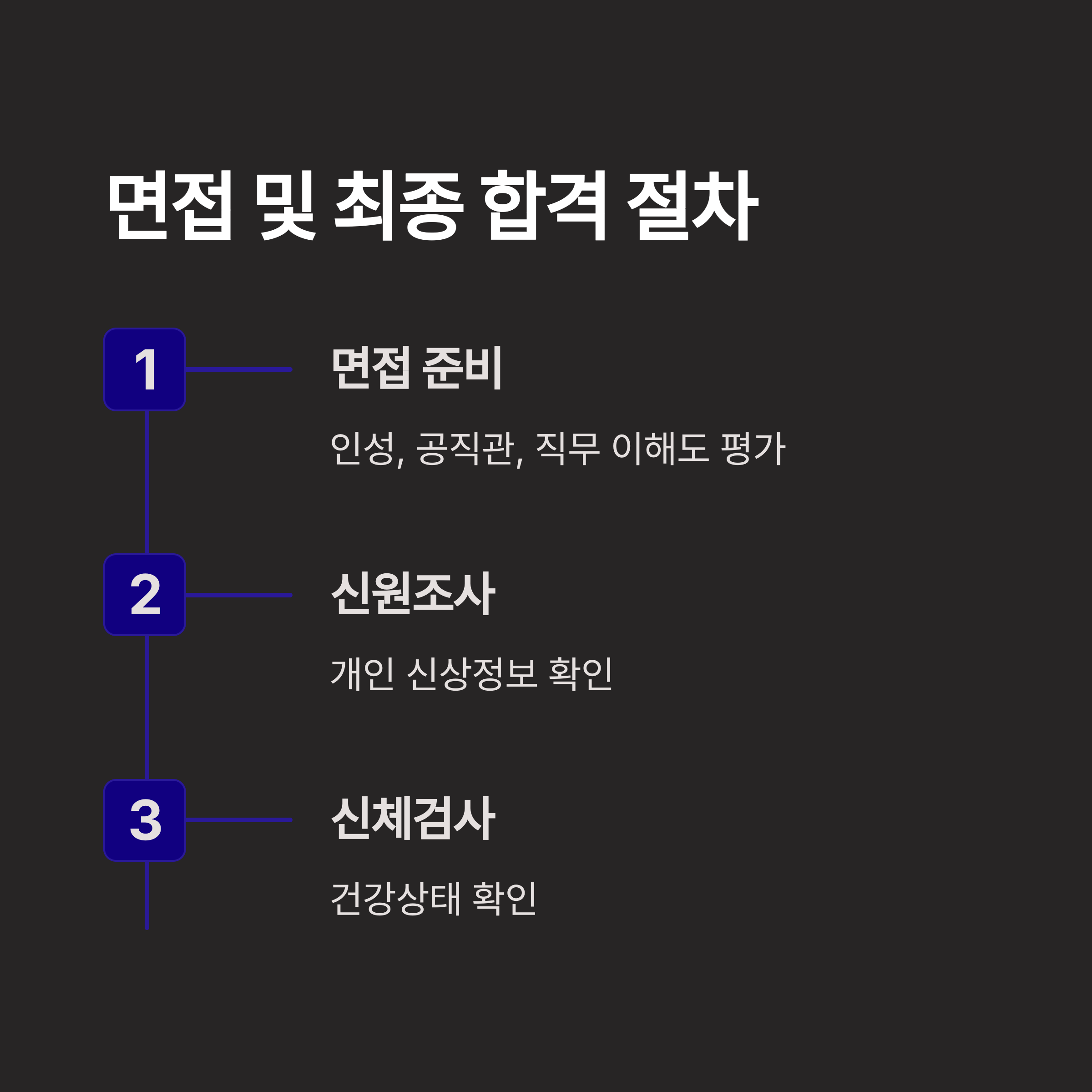 필기시험 합격 후 면접을 통해 인성, 공직관, 직무 이해도 등을 평가받습니다. 예상 질문을 정리하고 실전 연습을 반복하는 것이 중요하며, 지원 직렬에 대한 이해와 자기소개 준비도 필수예요. 이후 신원조사와 신체검사를 통해 최종합격자가 확정됩니다.