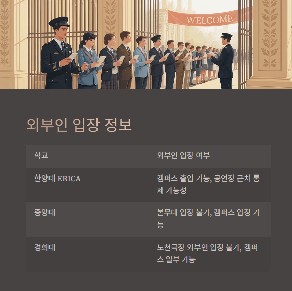 공통적으로 외부인도 캠퍼스 내 활동은 가능하나, 공식 공연장 좌석 관람은 제한되는 경우가 많습니다. 사전에 학교별 안내 채널을 통해 실시간 정보를 확인하는 것이 좋습니다.