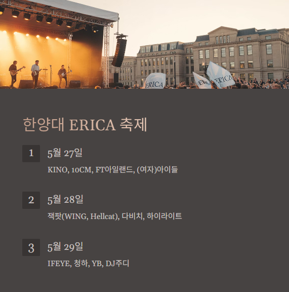 한양대학교 ERICA캠퍼스는 오는 **5월 27일(화)부터 5월 29일(목)**까지 축제를 진행합니다. 매일 4팀 이상의 유명 아티스트가 무대에 올라 학생들의 기대를 한 몸에 받고 있습니다.