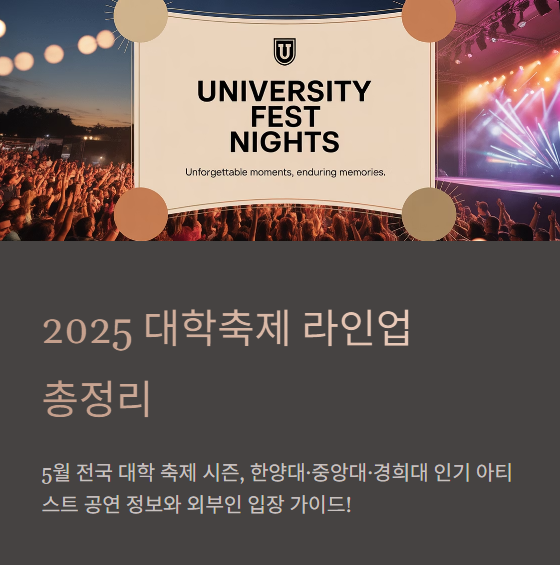 2025년 5월은 한양대, 중앙대, 경희대를 시작으로 전국 대학들이 축제의 열기로 가득합니다. 특히 2025 대학축제 라인업이 대형 페스티벌 못지않은 수준인 만큼, 사전 정보 체크 후 안전하고 즐겁게 관람하시는 걸 추천드립니다!