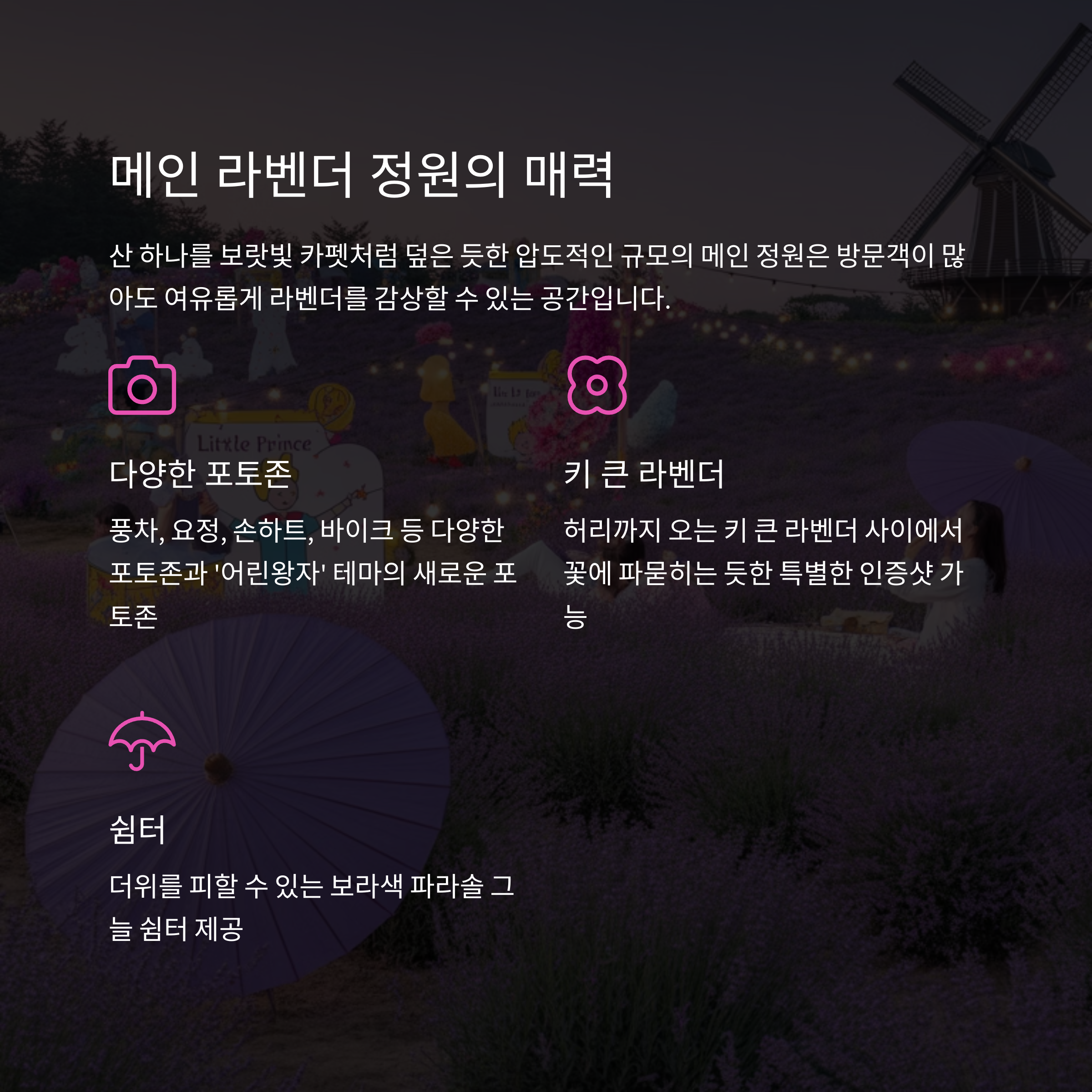 - 메인 정원: 산 하나를 보랏빛 카펫처럼 덮은 듯한 압도적인 규모를 자랑합니다. 넓어서 방문객이 많아도 서로 겹치지 않고 여유롭게 라벤더를 감상할 수 있습니다. 풍차, 요정, 손하트, 바이크 등 다양한 포토존이 마련되어 있으며, 허리까지 오는 키 큰 라벤더 사이에서 꽃에 파묻히는 듯한 특별한 인증샷을 남길 수 있습니다. 올해는 '어린왕자' 그림으로 채워진 새로운 포토존도 추가되어 볼거리가 더욱 풍성해졌습니다. 더위를 피할 수 있는 보라색 파라솔 그늘 쉼터도 있습니다.