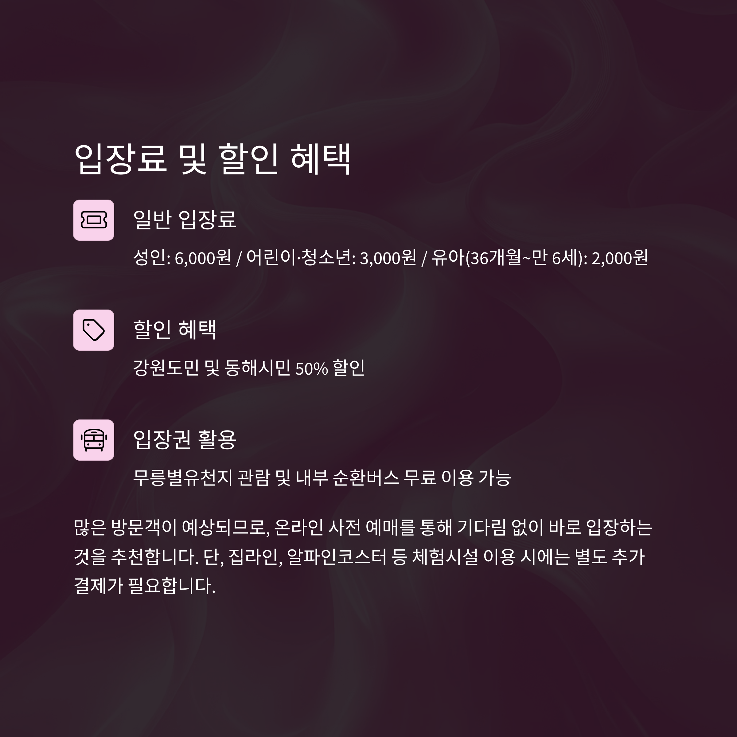 - 할인 혜택: 강원도민 및 동해시민에게는 입장료 50% 할인이 적용됩니다.