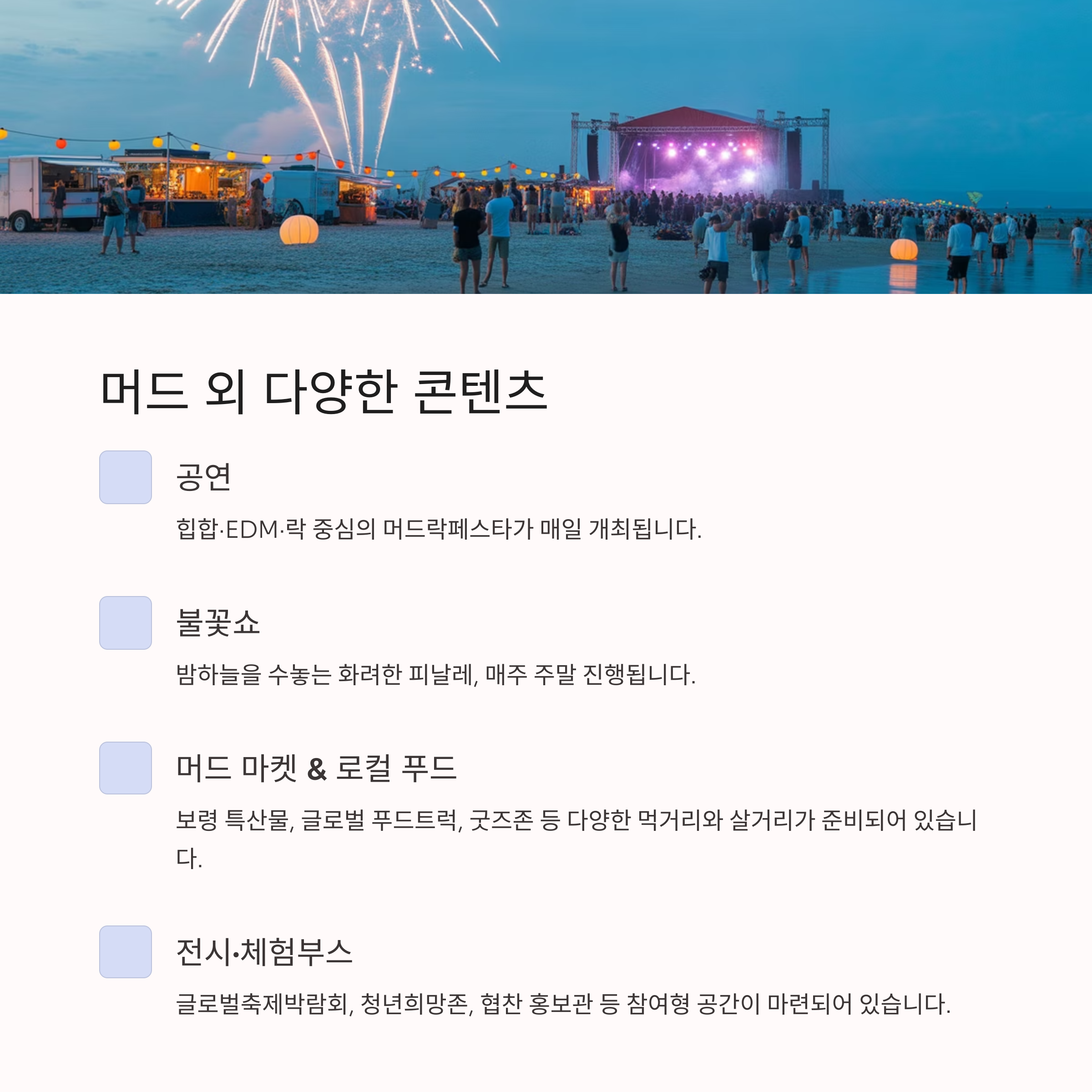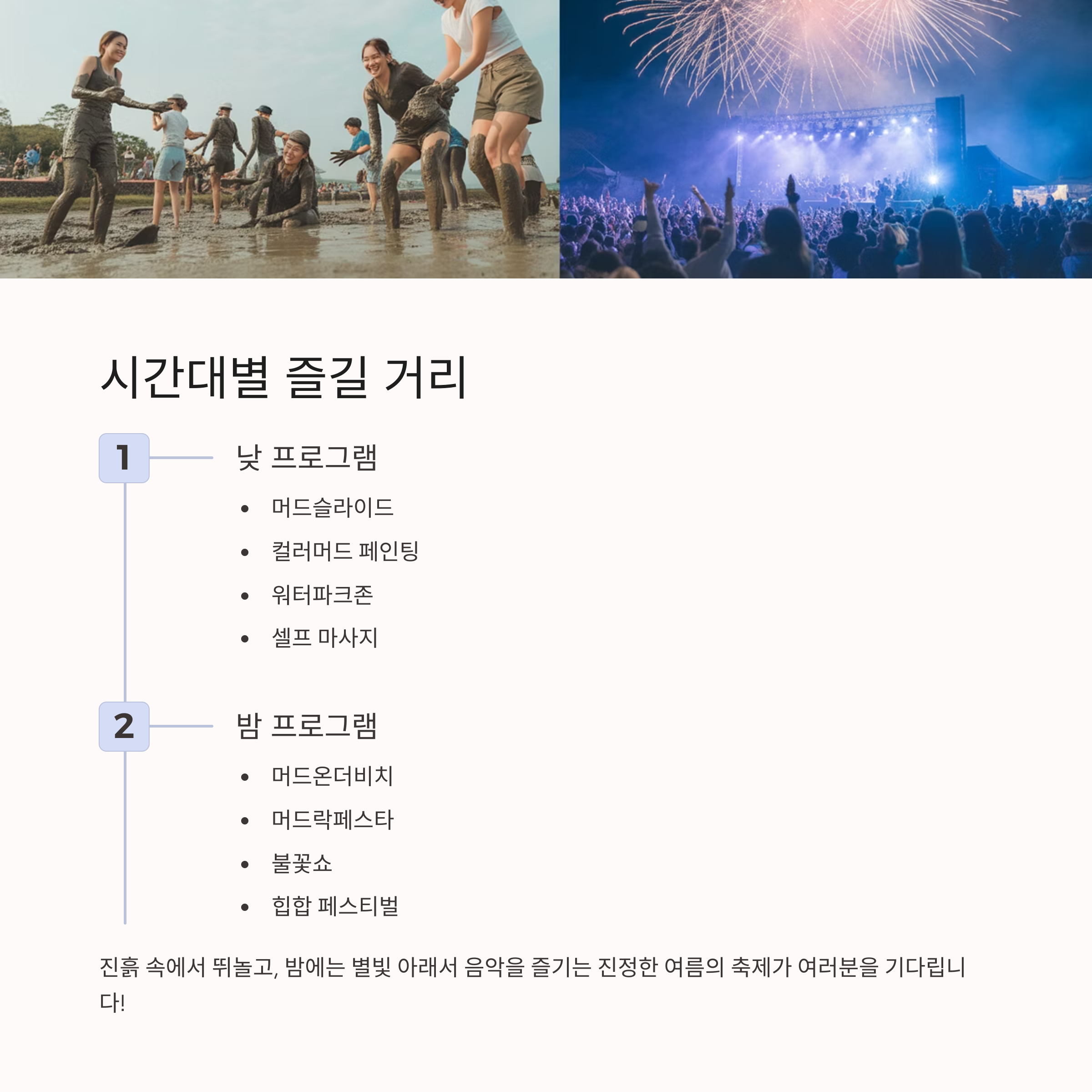 - 공연: 힙합·EDM·락 중심의 머드락페스타 매일 개최