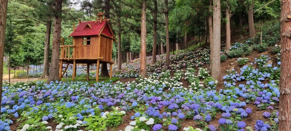 - 제1수국원 (40분): 다양한 색깔의 수국이 어우러진 메인 관람 구역이에요. 오두막과 아기자기한 조형물이 곳곳에 있어 멋진 사진을 남기기 좋습니다.