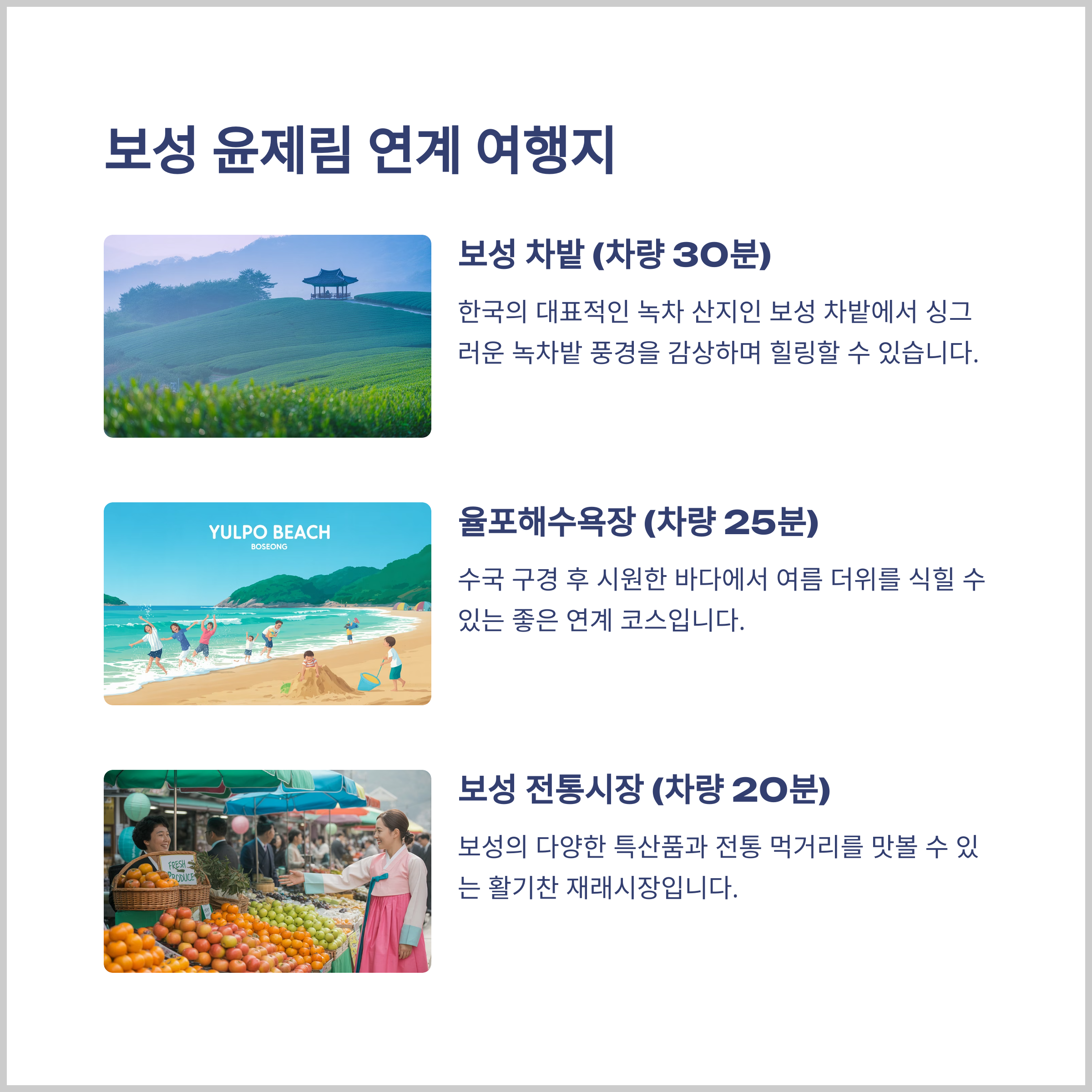 - 보성 전통시장 (차량 20분): 보성의 다양한 특산품과 전통 먹거리를 맛볼 수 있는 활기찬 재래시장입니다.