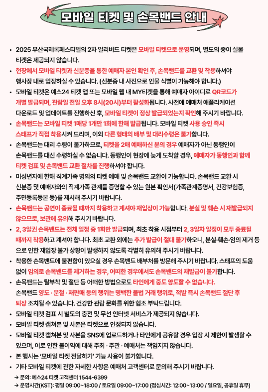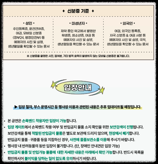 - 입장 시 모바일 티켓과 신분증 확인 후 손목밴드 착용 필수