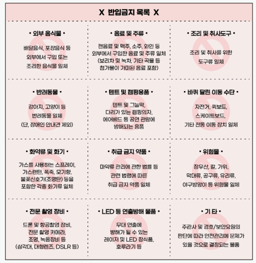 - 입장 게이트에서 모바일 티켓 → 손목밴드 → 보안 검색 순
