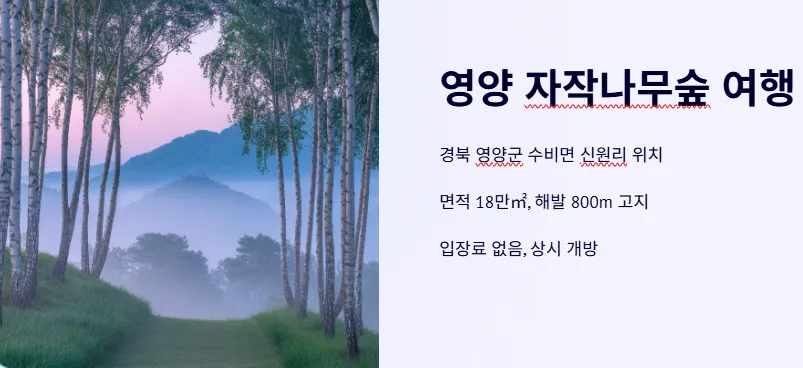 2025년 5월, 경북 영양 자작나무숲은 산림욕과 산책 여행지로 주목받고 있습니다. 입장료, 위치, 코스, 주차 등 방문 전 필요한 정보를 안내했습니다.