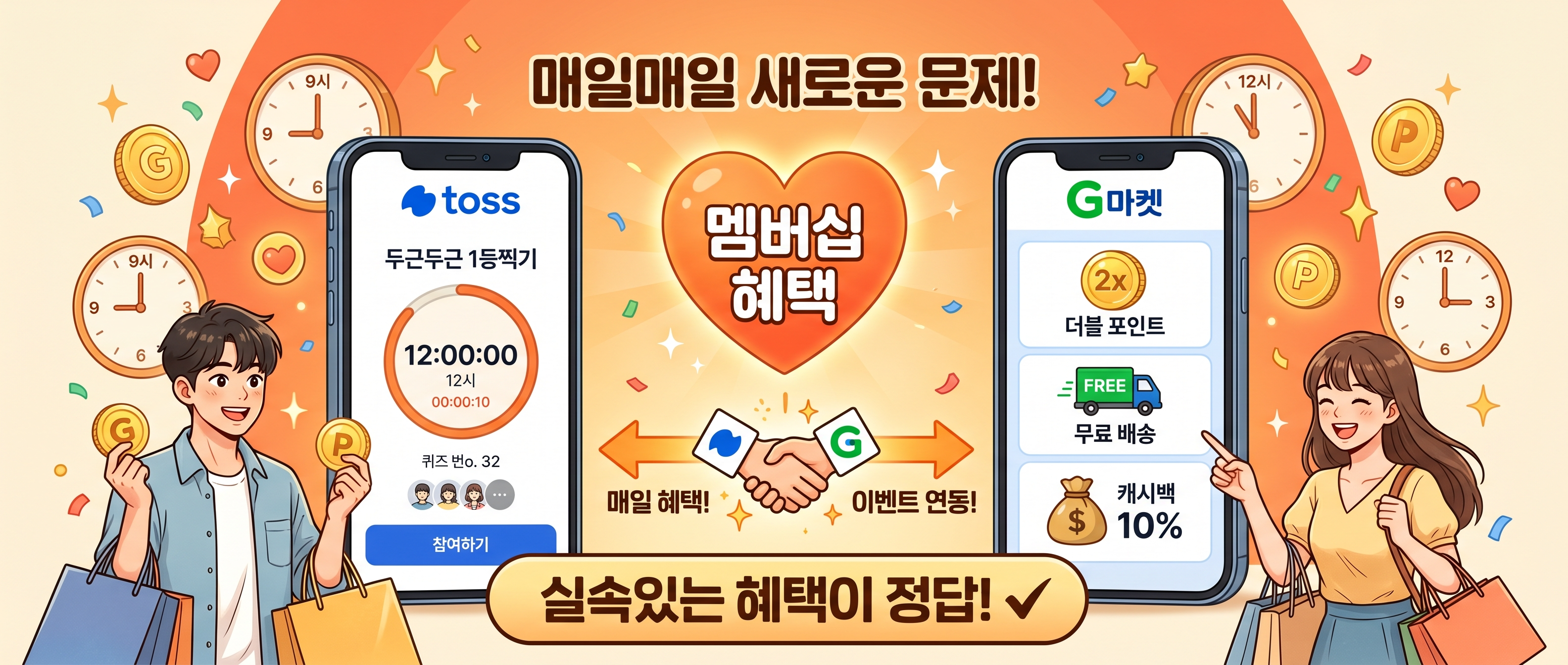 4월 24일 토스 두근두근 1등찍기 오늘의 정답은 오전 문제의 경우 '6일간 두배 적립'이었고, 오후 문제의 경우 '멤버십 사용료 보상'이었어요. G마켓 멤버십 혜택은 크게 적립과 할인, 그리고 부가적인 서비스로 나뉘는 경우가 많은데요.