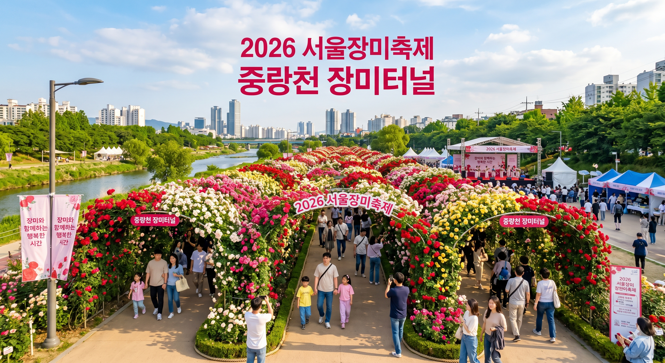 서울에서 장미를 만끽하고 싶다면 중랑천 서울장미축제를 꼭 기억하세요. 매년 5월 중랑천 장미터널을 중심으로 다채로운 행사가 열리는데, 약 5.15km에 이르는 장미터널은 정말 장관을 이룬답니다.