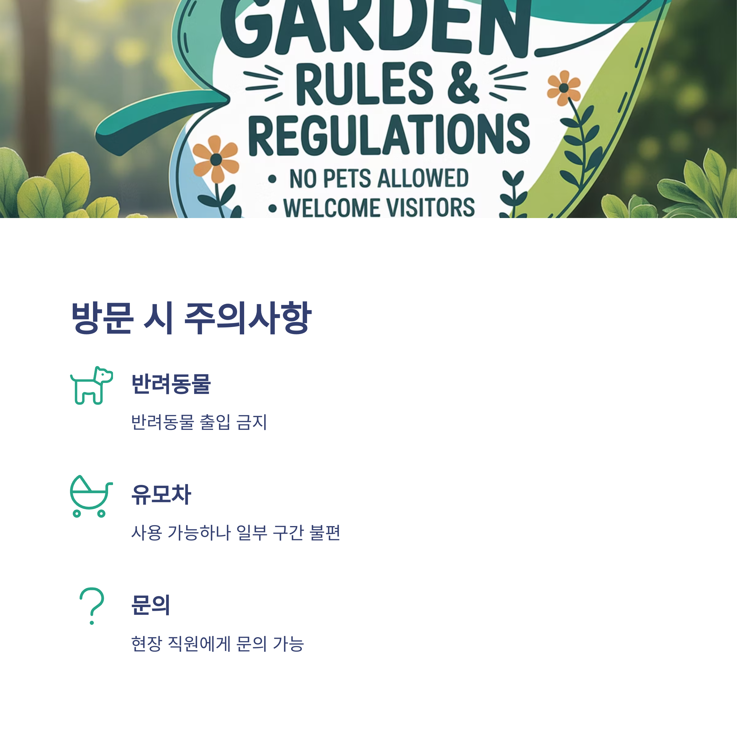 율봄식물원은 반려동물 출입이 금지되어 있어요. 반려견과 함께하는 산책을 계획 중이라면 다른 장소를 고려해야 해요. 유모차는 사용 가능하지만, 비포장 구간이 있어 이동 시 약간의 주의가 필요합니다.