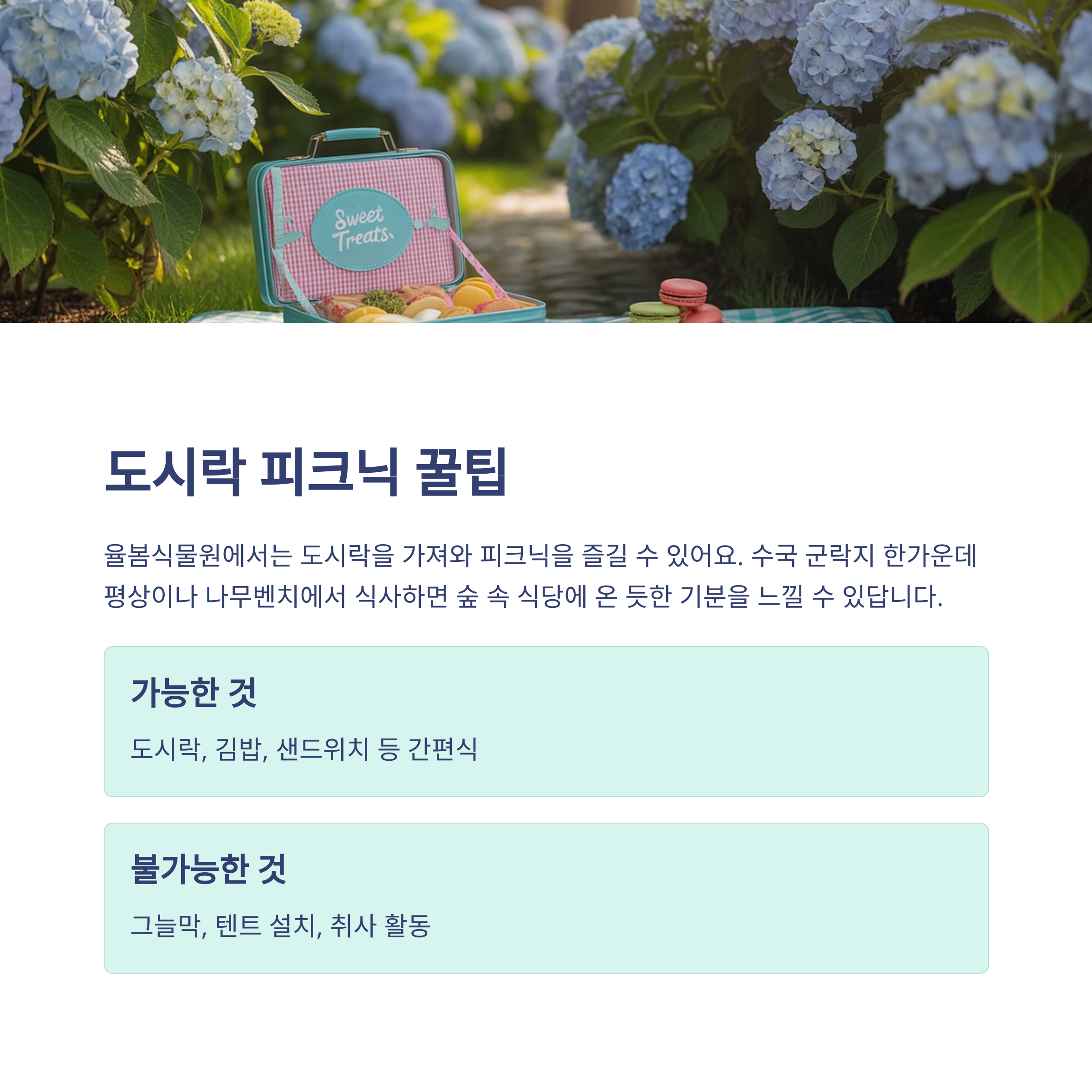 율봄식물원은 그늘막이나 텐트 설치는 불가하지만, 도시락을 가져와서 즐기는 피크닉은 가능해요. 특히 수국 군락지 한가운데 평상이나 나무벤치에서 식사를 하면 마치 숲 속 식당에 온 듯한 기분이 듭니다.